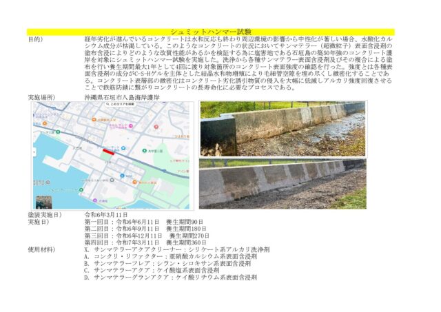 築50年の護岸コンクリートへの1年間の実証試験(シュミットハンマー試験)では、最大62%の驚異的な強度向上を実現しています。塩害や中性化が進行した老朽コンクリートでも確実な性能回復が可能であることが科学的に立証いたしました。