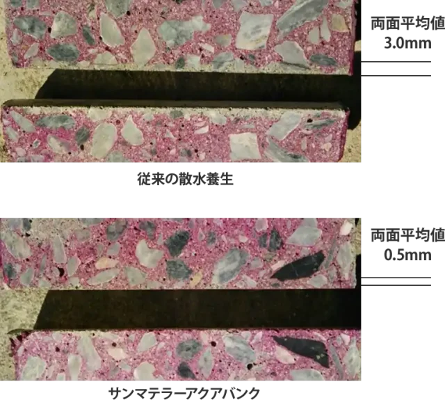 散水シート養生の平均3.0mmに対して、サンマテラーアクアバンクの中性化深さが平均0.5mmであると、約6倍もの差が出ています。